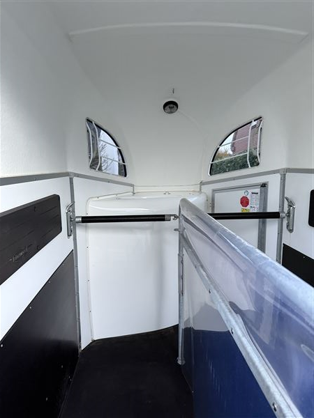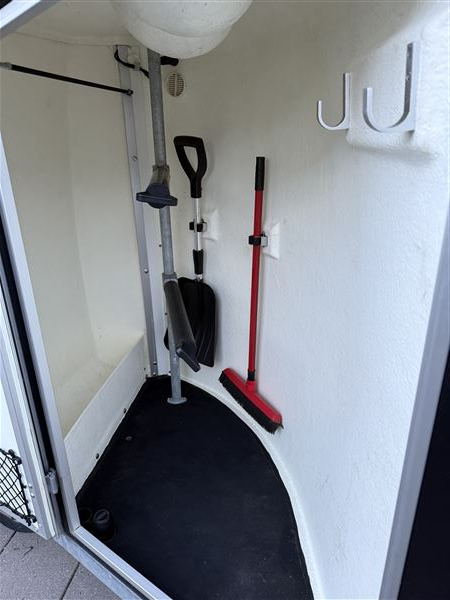 Sadelrum med 2 sadelholdere, 2 trenseholdere og led belysning, Dørnet samt spejl på dør, skovl og kost med teleskopskaft