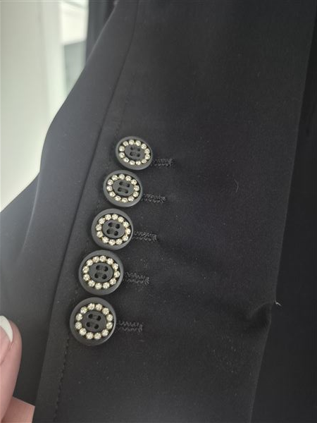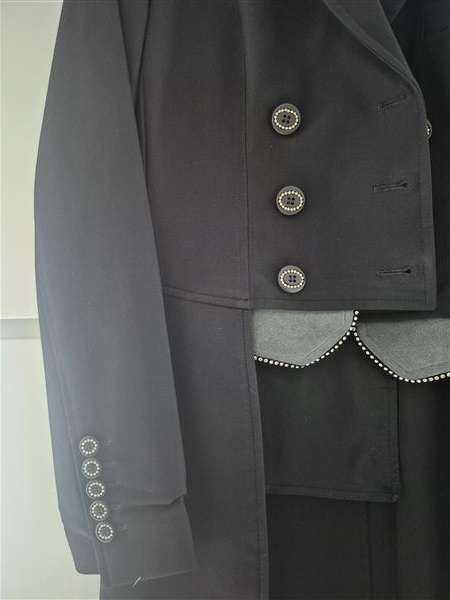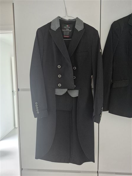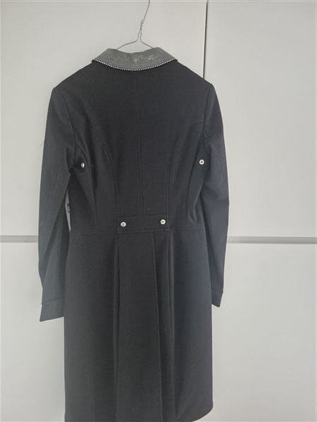 Den smukkeste dressurkjole i behagelig stretchkvalitet. Flotte knapper med similisten og grå kant og krave. Kun brugt 2 gange. Der står str 40 i den, hvilket i Eguiline svarer til str 36