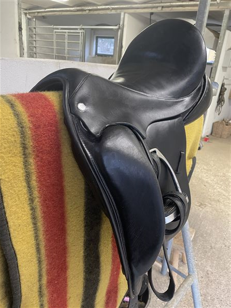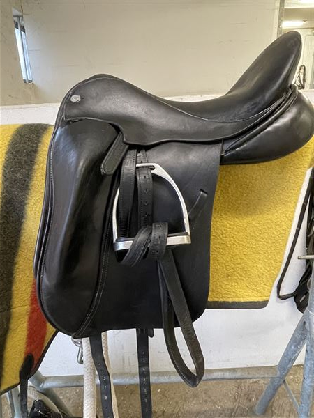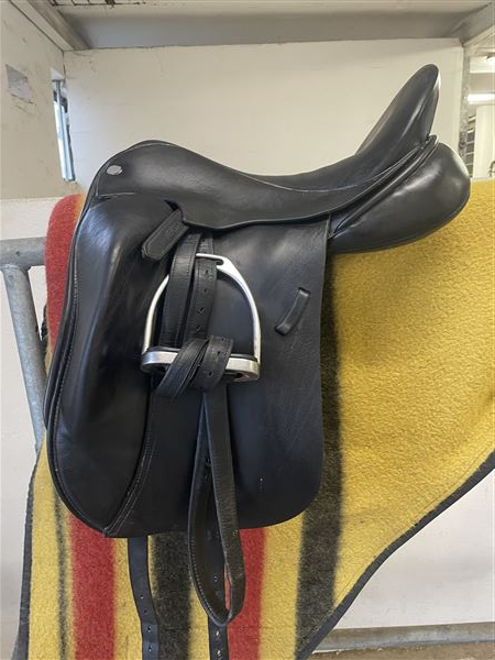 Dejlig blød dressursadel med alle de moderne detaljer som skulderfrihed og tryk fordelende gjordstropper. Behagelig for både hest og rytter. Kan ses i Allerød eller kbh