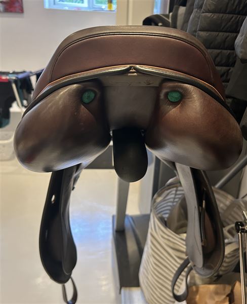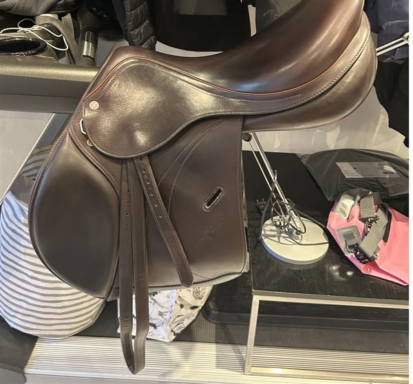 Brun springsadel fra Equipe i 17 tommer. Sadlen blev købt for ny for to år siden, men kun brugt omkring et halvt år - og passet meget på. Derfor er den stadig i god stand.