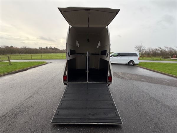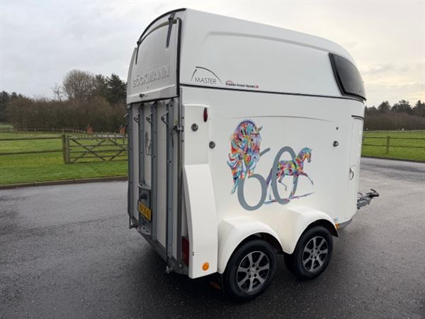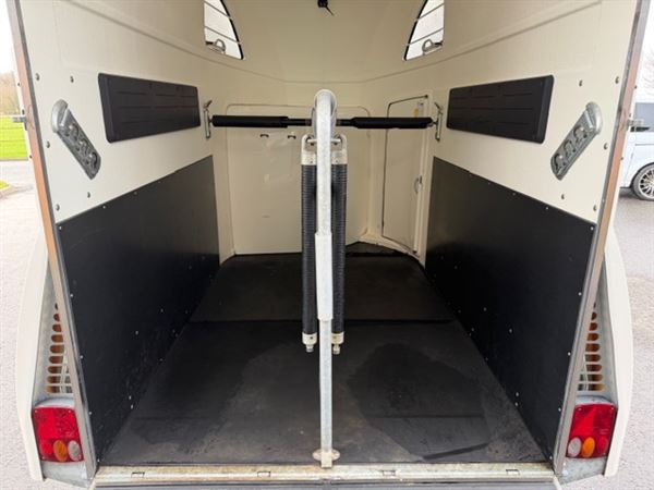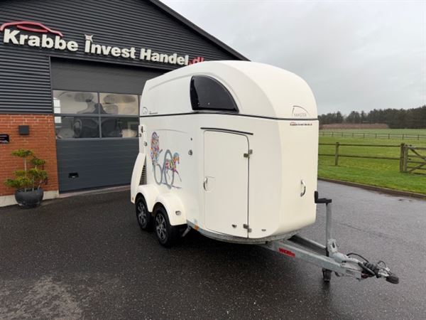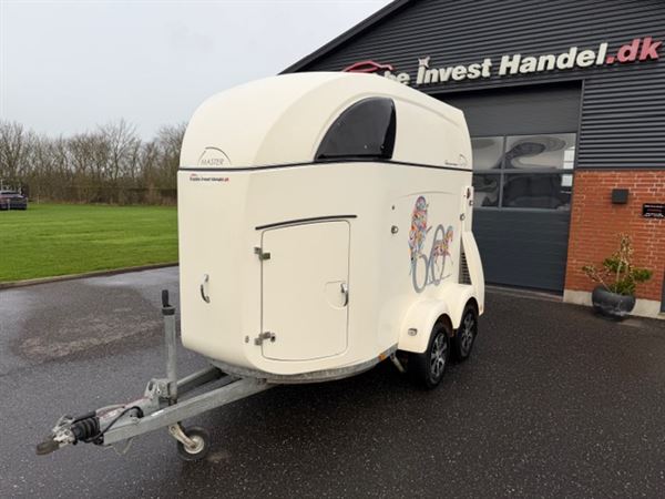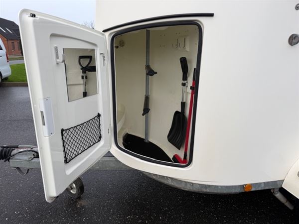Overvågning i trailer, for og bag bum justerbar, saddelskab med udtræk til 2 sadler. Spejl i dør til rytter, aluhjul.