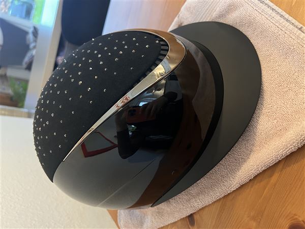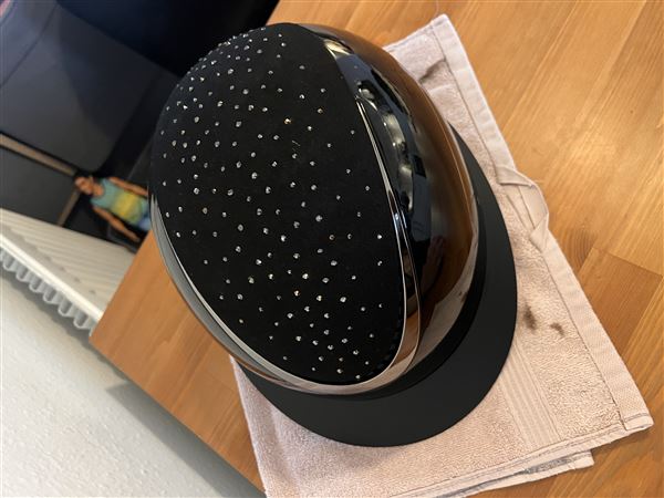 Ridehjelm i højglans finish, dekoreret midterplade med imiteret ruskind og sorte rhinsten. Med MIPS for øget beskyttelse mod hjernerystelse. S: 52-54, M: 55-57, L: 58-60. Godkendt i henhold til den seneste CE-standard EN1384:2023.