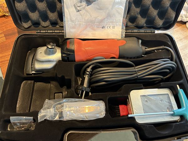 Helt ny klipper i praktisk kuffert. Ekstra skær og tilbehør medfølger.