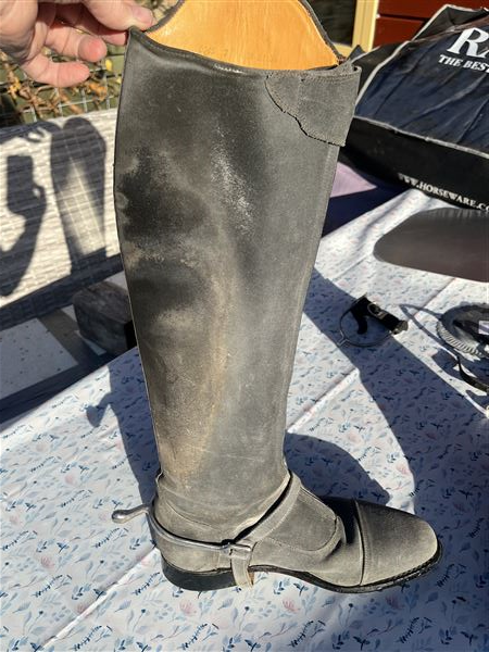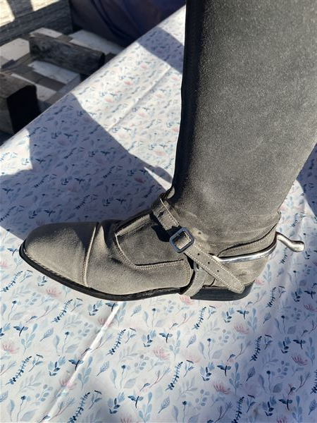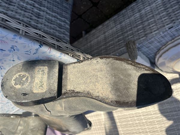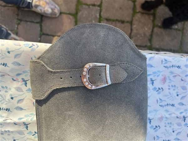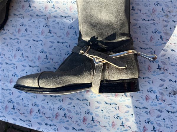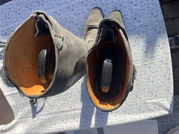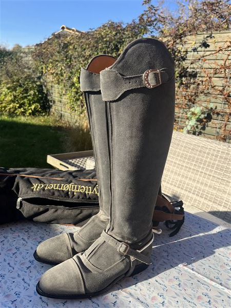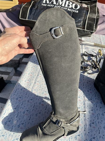 Smuk drømmestøvle i lysegråt ruskind med den bedste pasform med superlækkert læder indvendig og praktiske gummisåler. Sparsomt brugt, da jeg gik over til jodphurs. Der er fine sten foroven og dertilhørende sporeremme i gråt ruskind.