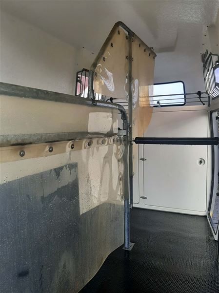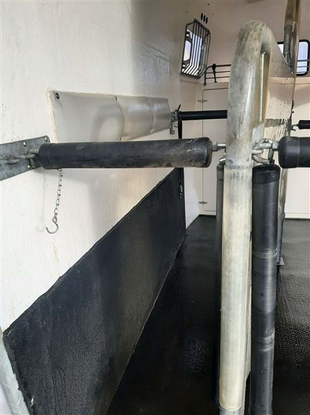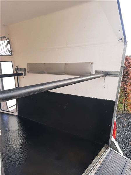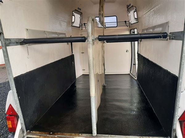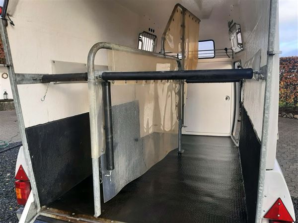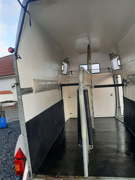 Meget velholdt 2 hestes Mustang Hestetrailer. Støbt gummigulv, sidepolstring, hingstegitter, vinduer der kan åbnes + vindue i fronten, flere bom systemer, reservehjul, trailer lås og trådløst kamera. 2 indvendige skabe m plads til 2 sadler m.m En rigtig fin trailer.