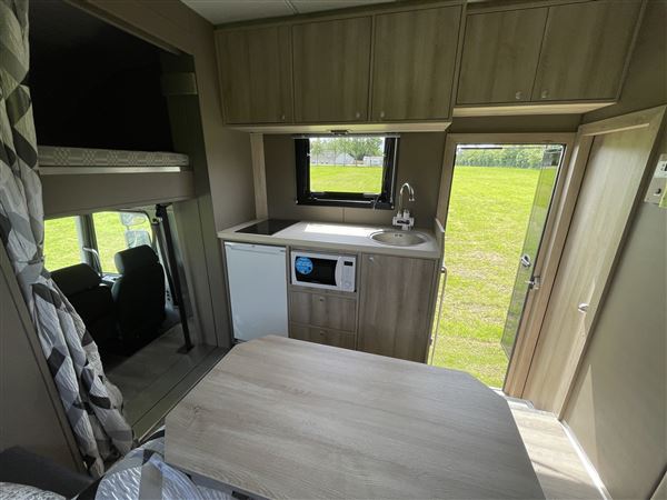 - Køkken med køleskab, kogeplader og mikroovn