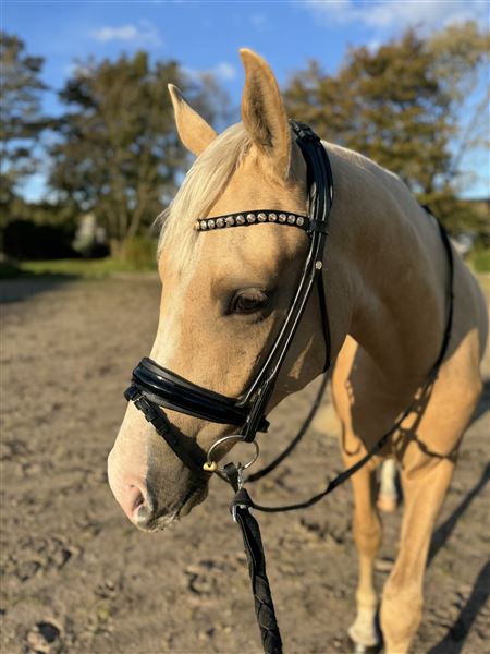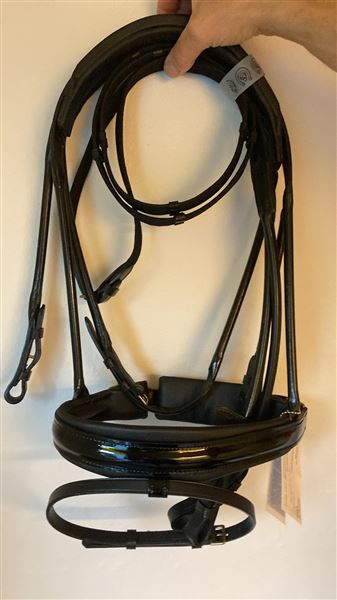 Helt ny OS München trense sælges, kun prøvet på enkelte gange. Pandebånd medfølger IKKE. Tøjler medfølger selvfølgelig. Trensen er med lak på næsebåndet og alle spænder i guld. OS pose medfølger også. Trensen er str cob.