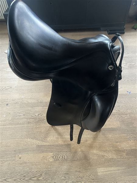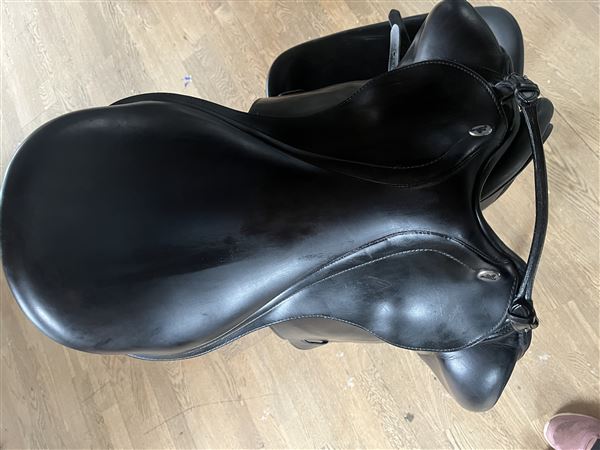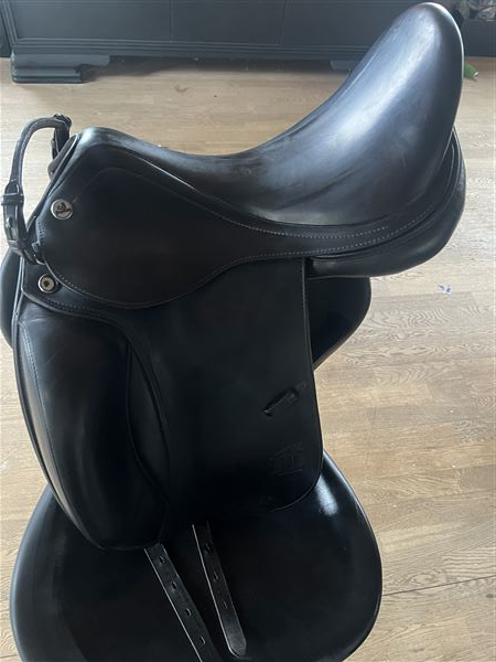 Super lækker prestige med stor skulderfrihed. Den har et dybt sæde med store udvendige bløde knæpuder. Den er 17” og har en L bom. Den kan ændres ved sadelmager. Sadlen er velholdt og har hængt i opvarmet skab. Den kommer med prestige sadelovertræk