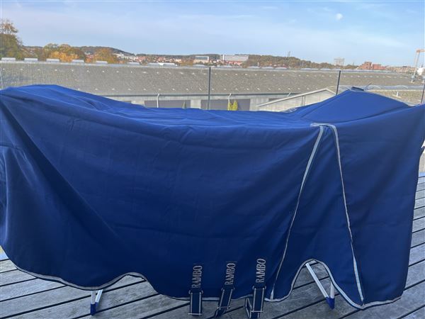 Rambo Optimo Stable sheet med 0g str. 155. Fremstår som nyt, kun brugt 2 nætter, da det desværre ikke passer min hest. Perfekt til kølige sommernætter eller under et regndækken til overgang