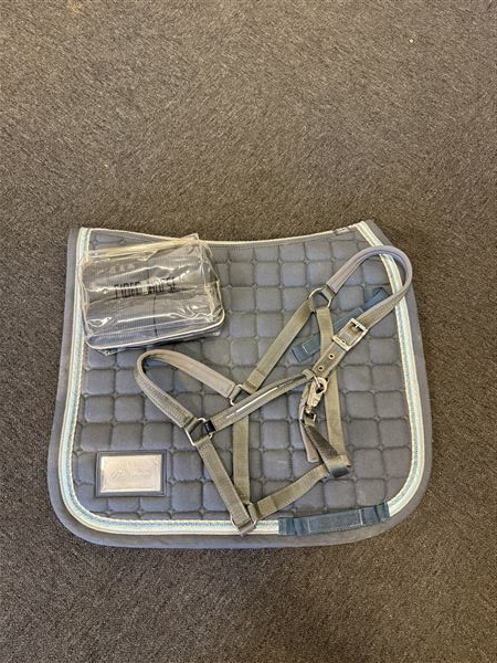 Let brugt sæt fra Rider by Horse. Ingen tegn på slitage. Der sidder lidt hestehår i underlaget (se billede). Sættet inkluderer underlag, grime og bandager i matchende farve