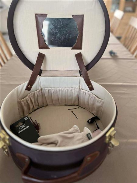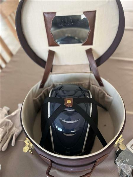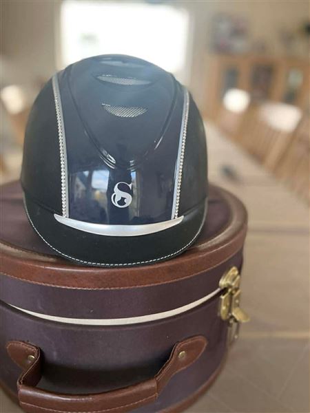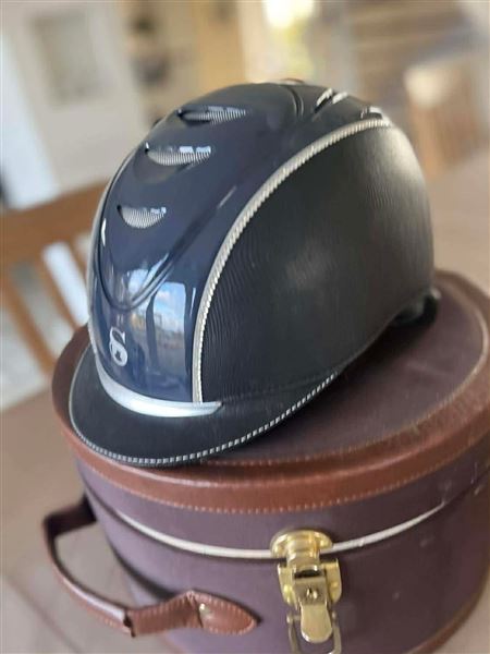 Flot mørkeblå ridehjelm. Kun brugt til stævner. Sælges med hatteæske