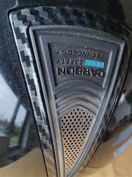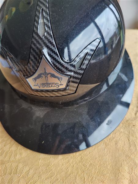 Veredus Carbon gel Safety Technology ridehjelm i størrelse 59L. Hjelmen er blank sort med fine detaljer. Indersiden har polstret og ventileret foring samt justerbar hagerem med klik spænde.